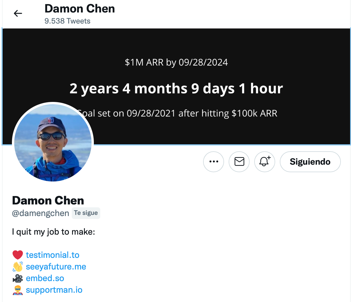 Existen productos parecidos a Testimonial, pero la verdad es que Damon lo está haciendo todo MUY BIEN. Dejó su trabajo como desarrollador para convertirse en "maker" y construir sus propios negocios. Sin duda, Damon es un gran exponente del fenómeno #BuildInPublic.