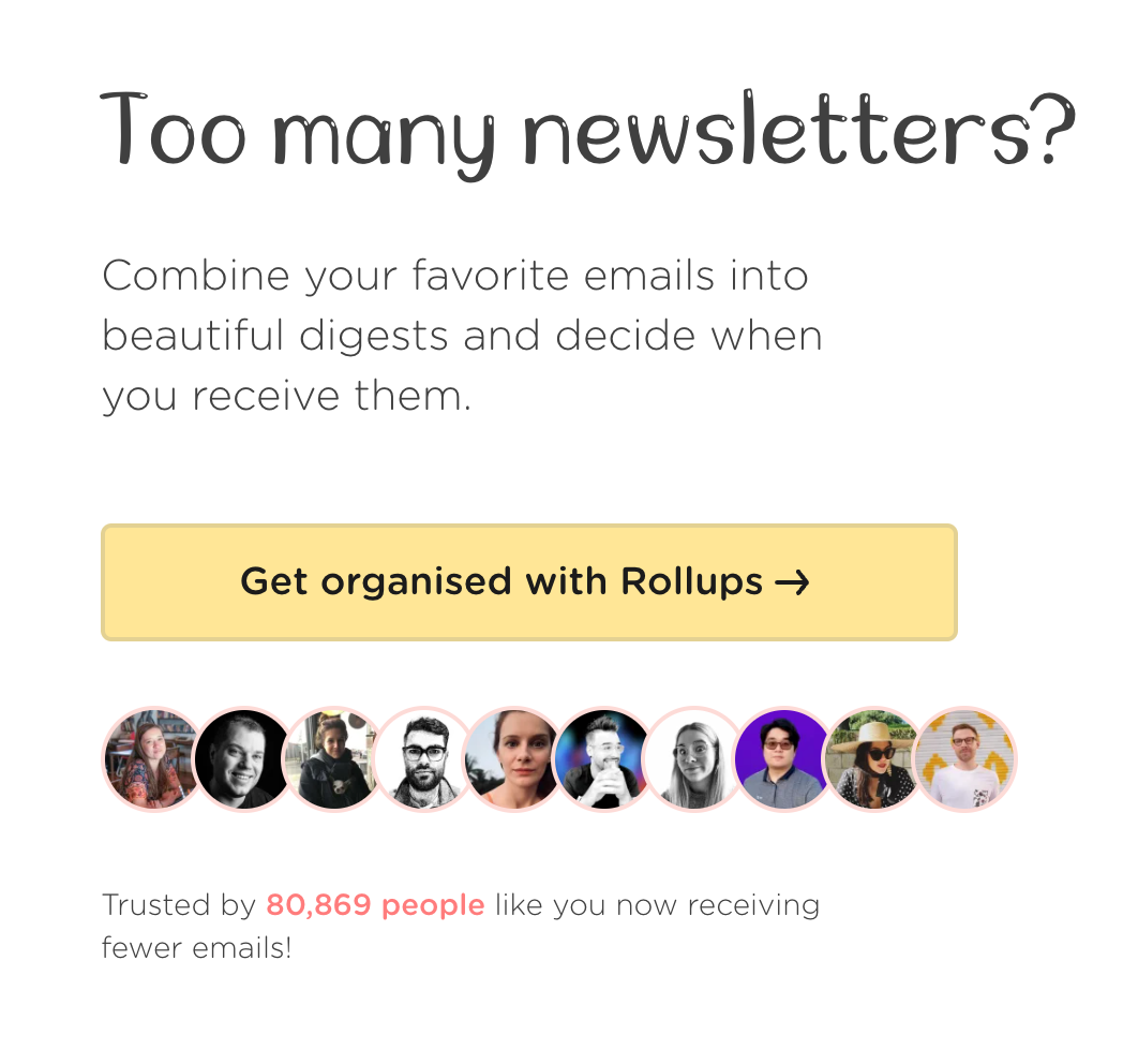 Leave Me Alone es un servicio que te permite visualizar de un plumazo todas las newsletters a las que estás suscrito y darte de baja con un click. Además, su funcionalidad "Rollups" combina todos los emails que realmente te interesan y los agrupa para que puedas verlos cómodamente en web.