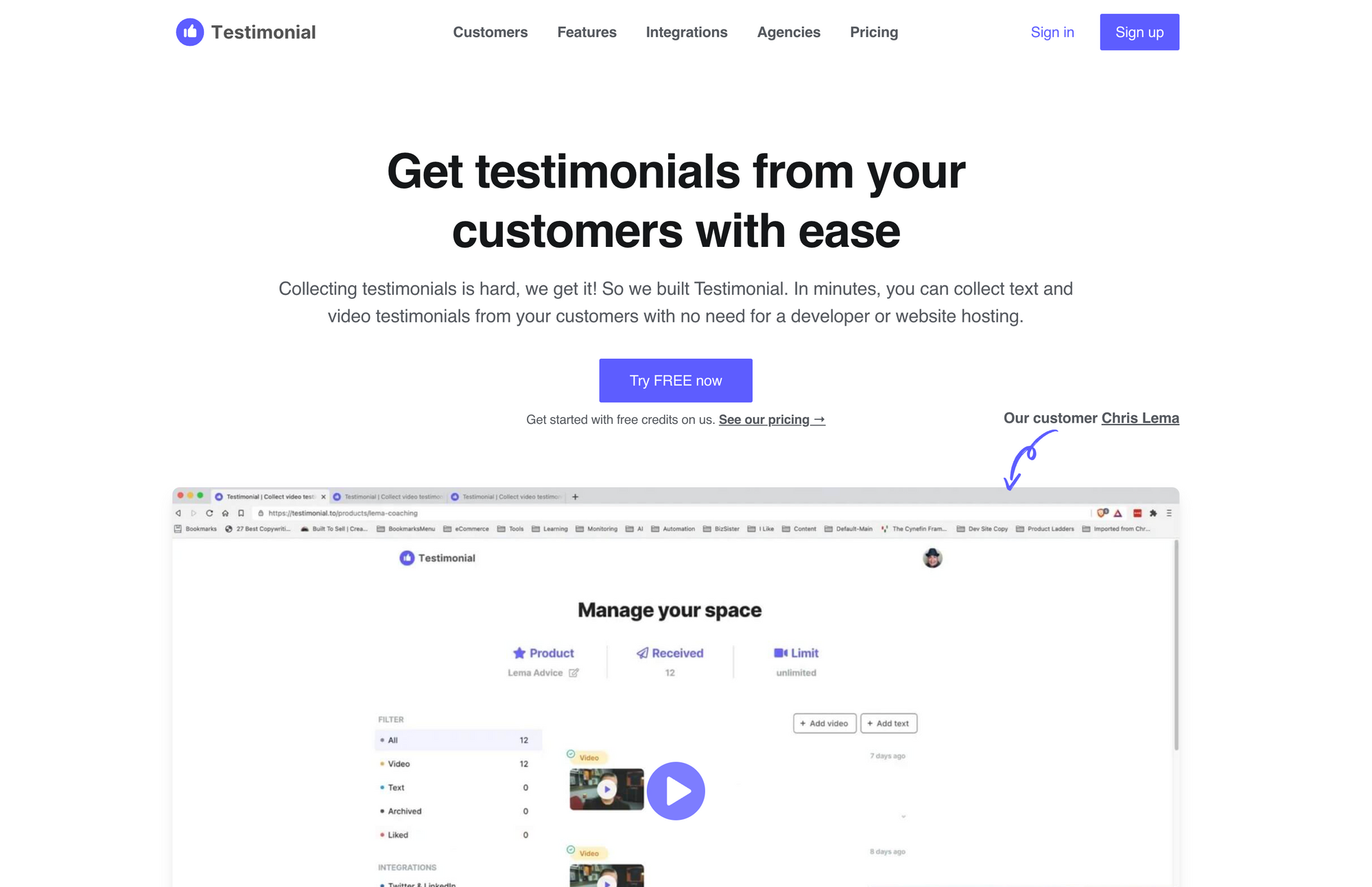 Conseguir o recopilar los testimonials de los clientes no es tarea fácil, ni mucho menos, y puede convertirse en algo bastante engorroso... Es aquí donde entra en juego Testimonial, una fantástica herramienta (desarrollada por una única persona) que permite conseguir testimonials de clientes en formato texto o vídeo (BOOM!) de forma súper fácil. Además, con estos testimonials puedes construir tu "Wall of love" (muro del amor) y mostrarlos todos para que otros usuarios los puedan ver. Aquí puedes ver el Wall of Love del propio Testimonial.
