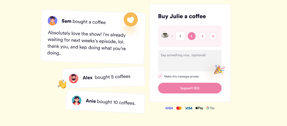 En BuyMeACoffee los creadores de contenido pueden obtener un enlace que comparten con su audiencia. Con este enlace les pueden comprar un café que en realidad es una donación ya que el café nunca llega realmente.