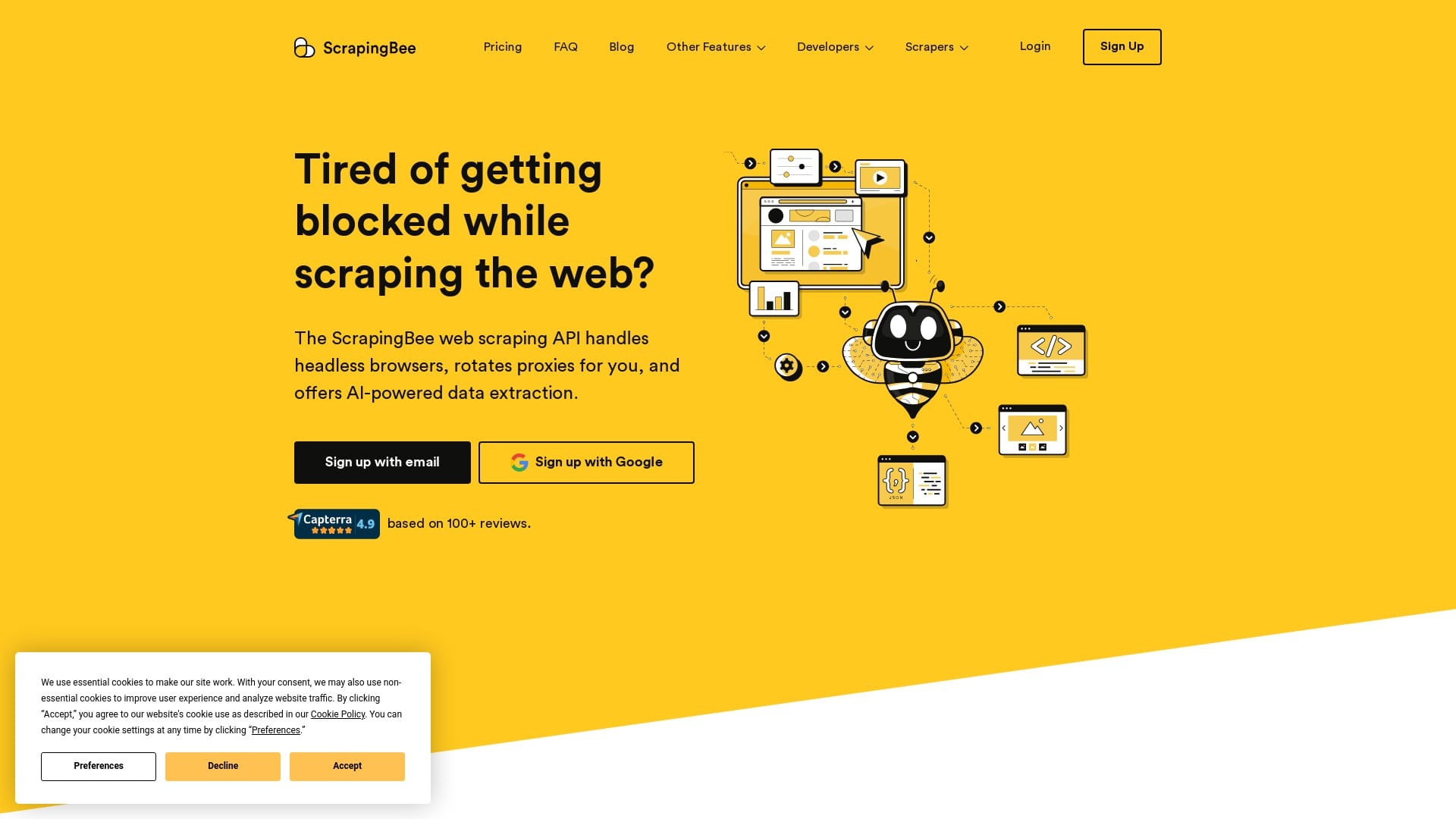 ScrapingBee es una API (en formato SaaS) que te facilita el web scraping sin romperte la cabeza en exceso: gestionan proxies, cabeceras, captchas y hasta renderiza JavaScript por ti. Tú solo haces una petición y la herramienta te devuelve el HTML limpio, como si fueras un humano navegando.