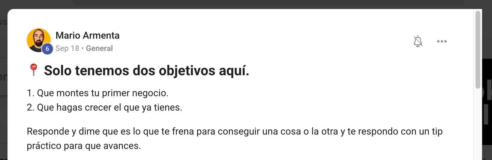 En esta comunidad, además de cursos y contenidos, Mario resuelve dudas personalmente, organiza mentorías colectivas y, en definitiva, ayuda a emprendedores a construir, lanzar y hacer crecer negocios.