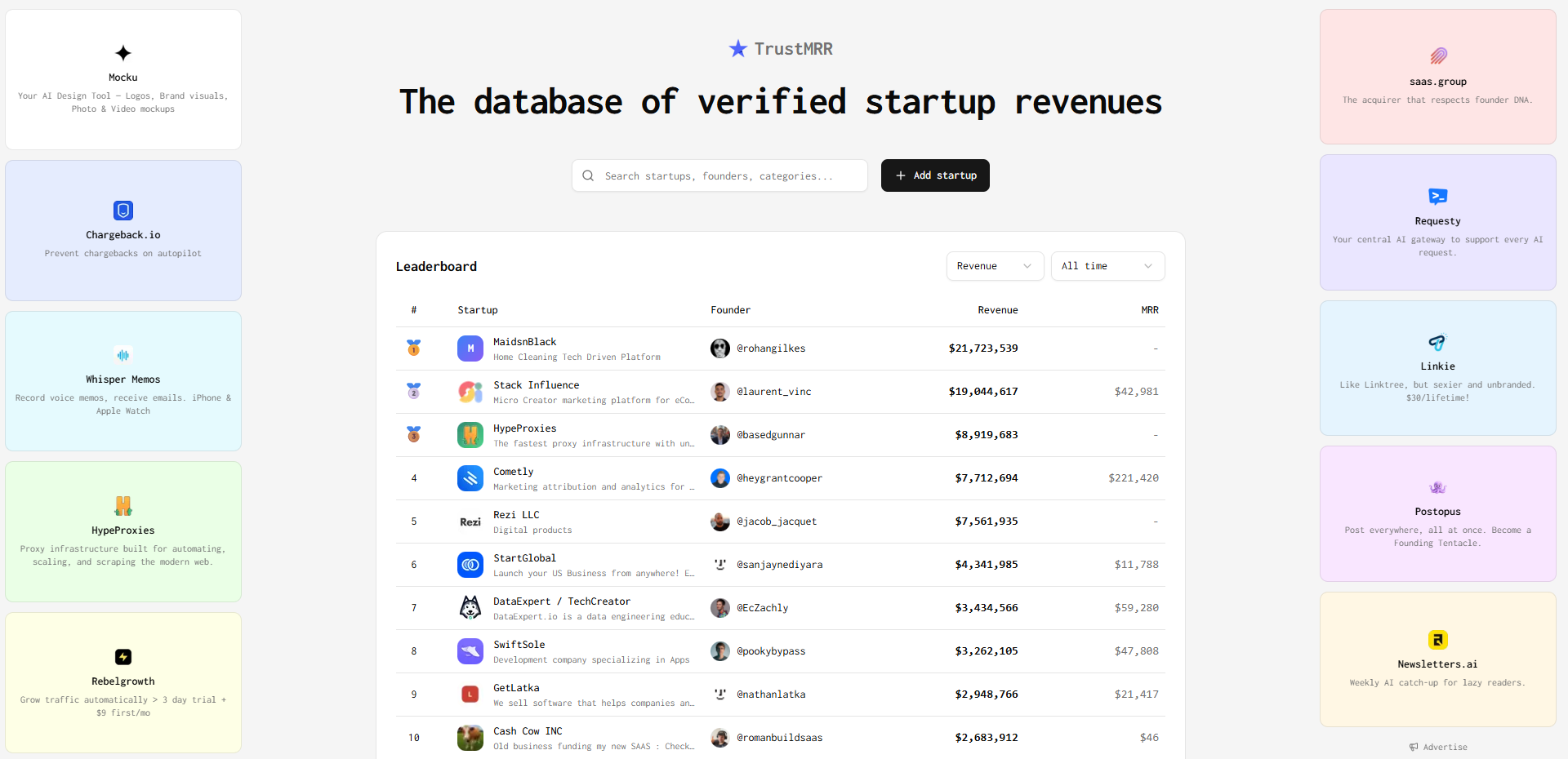 Marc Lou, el tipo que lanza más proyectos que tweets, ha creado TrustMRR, una base de datos de proyectos con ingresos verificados. Se conectan a Stripe y demuestran quién es el número #1.