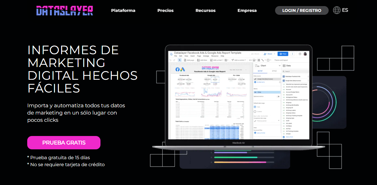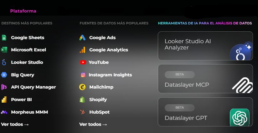 Hasta que en 2020 apareció Dataslayer, un conector de datos de marketing que automatiza el volcado de campañas y métricas a Google Sheets, Excel, Looker Studio, BigQuery y otras herramientas BI. Se posicionan claramente como la alternativa más barata y sencilla a Supermetrics, con el mismo tipo de casos de uso: agencias, equipos de performance y analistas que quieren tener todos los datos en un solo sitio (y actualizados).