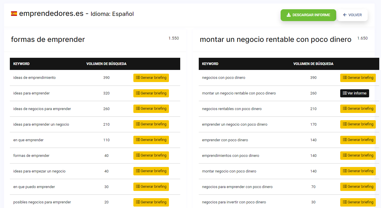 - A partir de esta información analizo las SERP y genero un briefing para cada post (título, encabezados...).