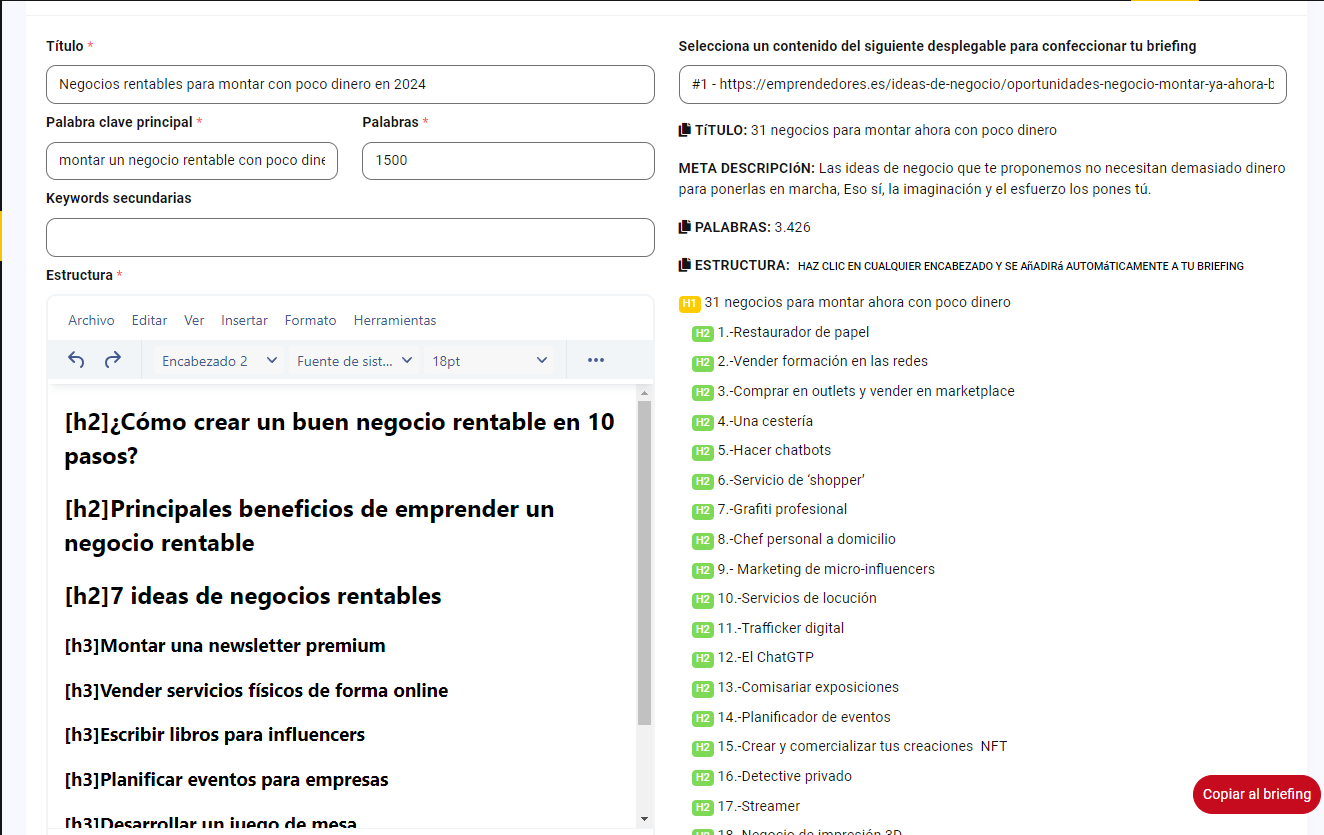 - Con el briefing, según el tipo de artículo, lo pido a redactores o le paso el briefing a la IA para que me lo rellene.