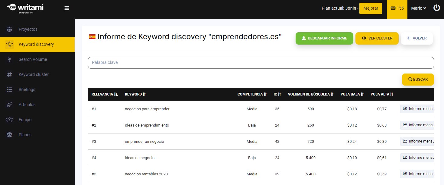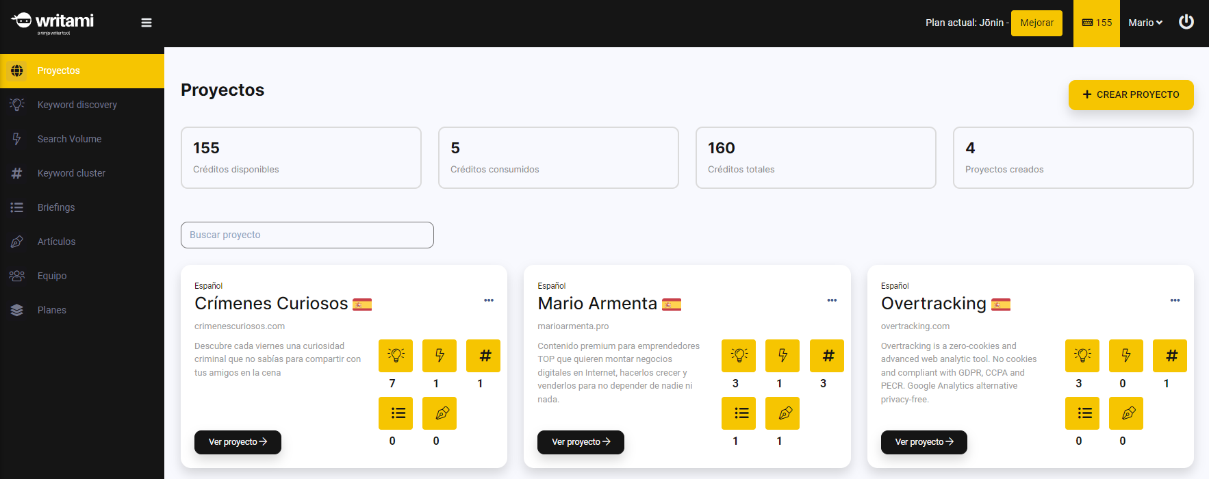 En concreto, con Writami, puedes buscar palabras clave, analizar el volumen de búsqueda de cientos de palabras a la vez, hacer clusters por intención de búsqueda, crear briefings SEO, analizar las SERPS y generar artículos con la IA a partir de la información obtenida en Google.